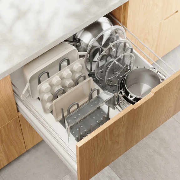 - Кладовая/Кухня: Идеально подходят проволочные стеллажи: они обеспечивают циркуляцию воздуха и облегчают очистку пролитой жидкости. Добавьте вкладыши на полки для мелких предметов.